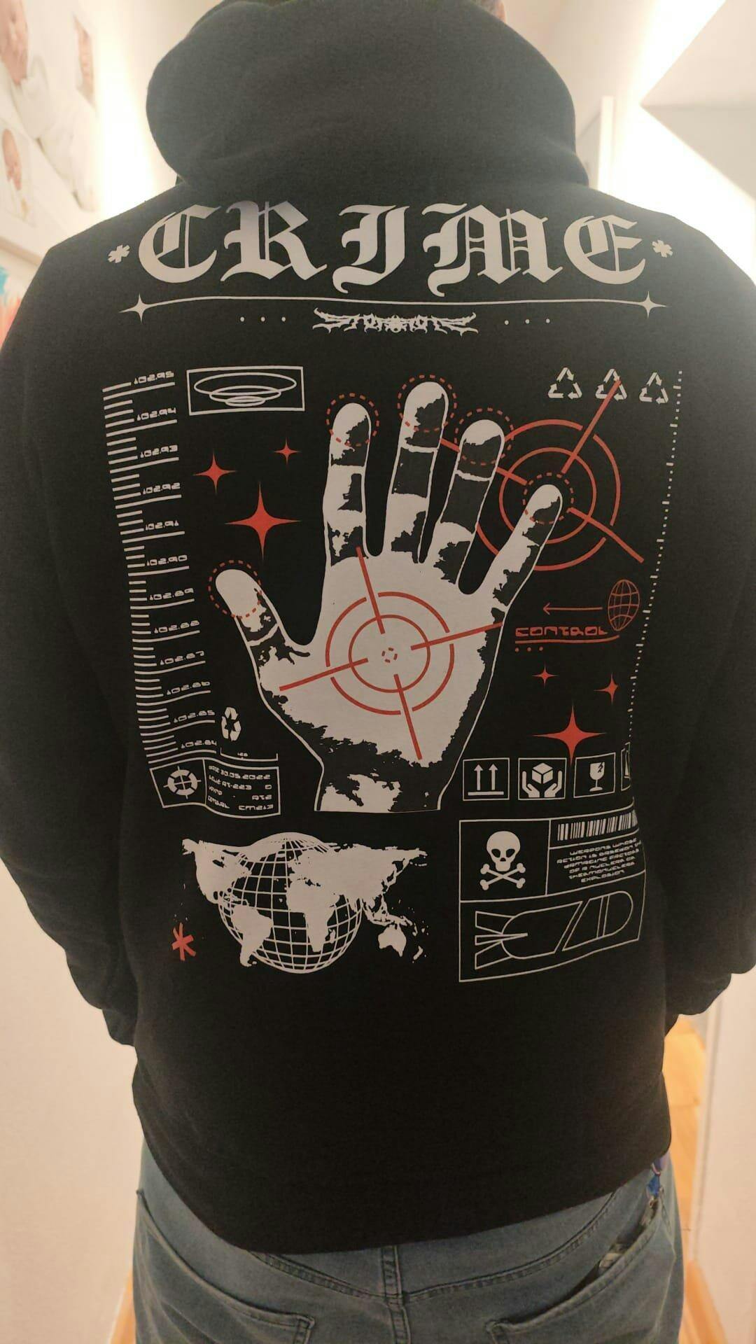 Großer Rückenprint mit „CRIME“-Typo, gescannter Handfläche, roten Target-Elementen, Tech-Grids, Icons und Weltkarten-Grafik – ein schwarzer Cyber-Graphic Hoodie mit Hardcore-Attitude.