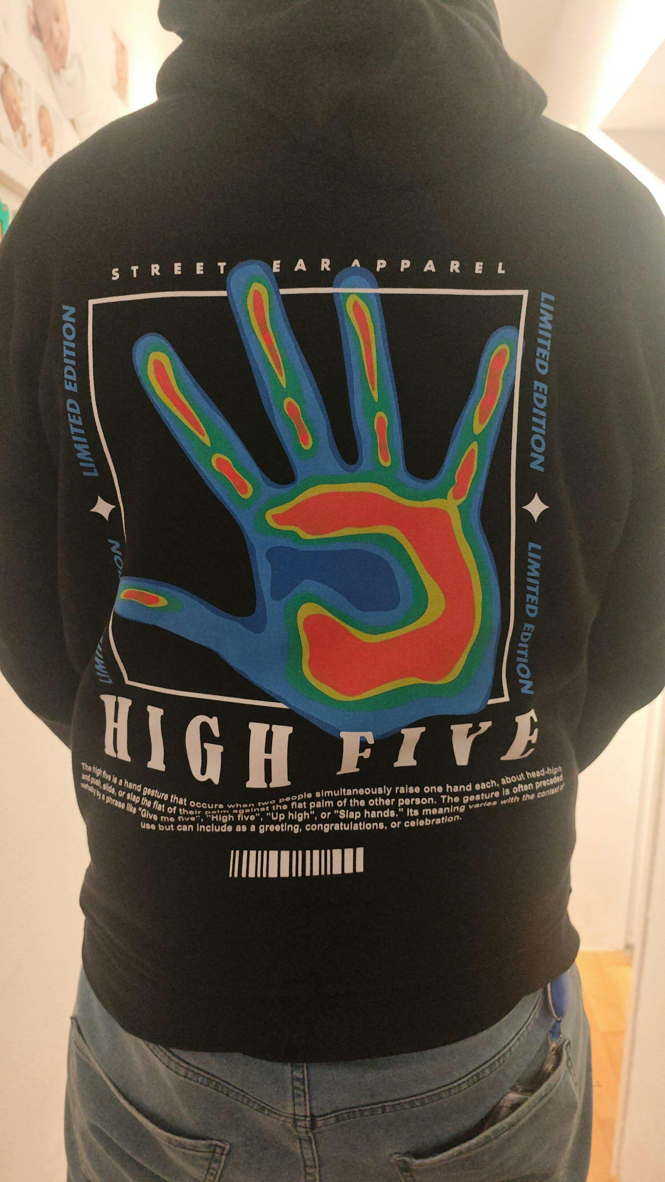 Großer Rückenprint mit bunter High Five-Heatmap-Hand, technischen Rahmen-Details und cleanem Textlayout – ein schwarzer Graphic Hoodie voller positiven Vibes.