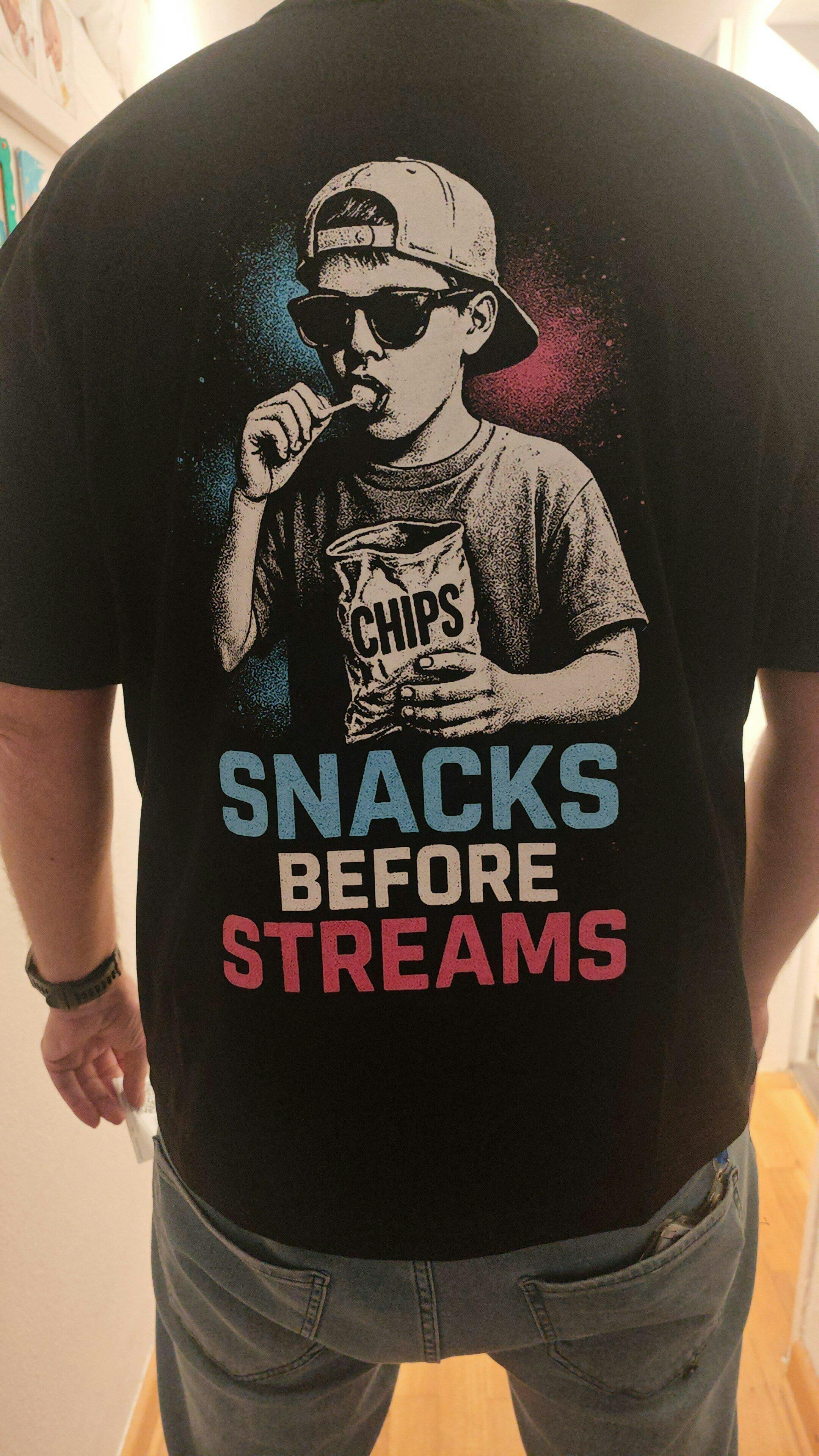 • Großer Backprint mit Kid im 90s-Style, Sonnenbrille, Chips und neonfarbenem „Snacks Before Streams“-Typo